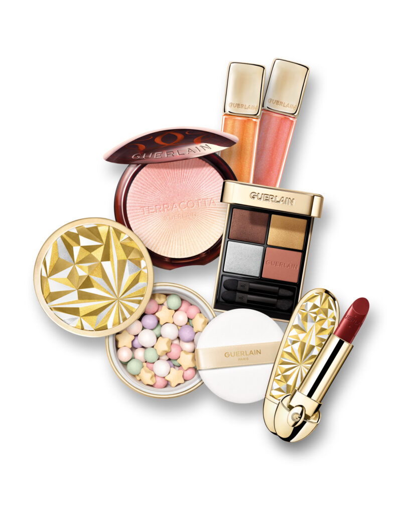 Eine Make-up-Kollektion in edlen Origami-Designs aus Weiß, Gold und Silber. Der Rouge G Stellar zeigt sich in einem strahlenden Case und neuen Nuancen. Das Ombres G Stellar Glow-Quartett kombiniert Gold, Silber, Braun und Nude für einen leuchtenden Blick. Die Météorites Midnight Glow und das pflegende KissKiss Bee Glow Oil in zwei Nuancen sorgen für festlichen Glanz, vollendet vom Terracotta Luminizer Rosy Gleam mit sanftem Rosa-Pfirsich-Schimmer.